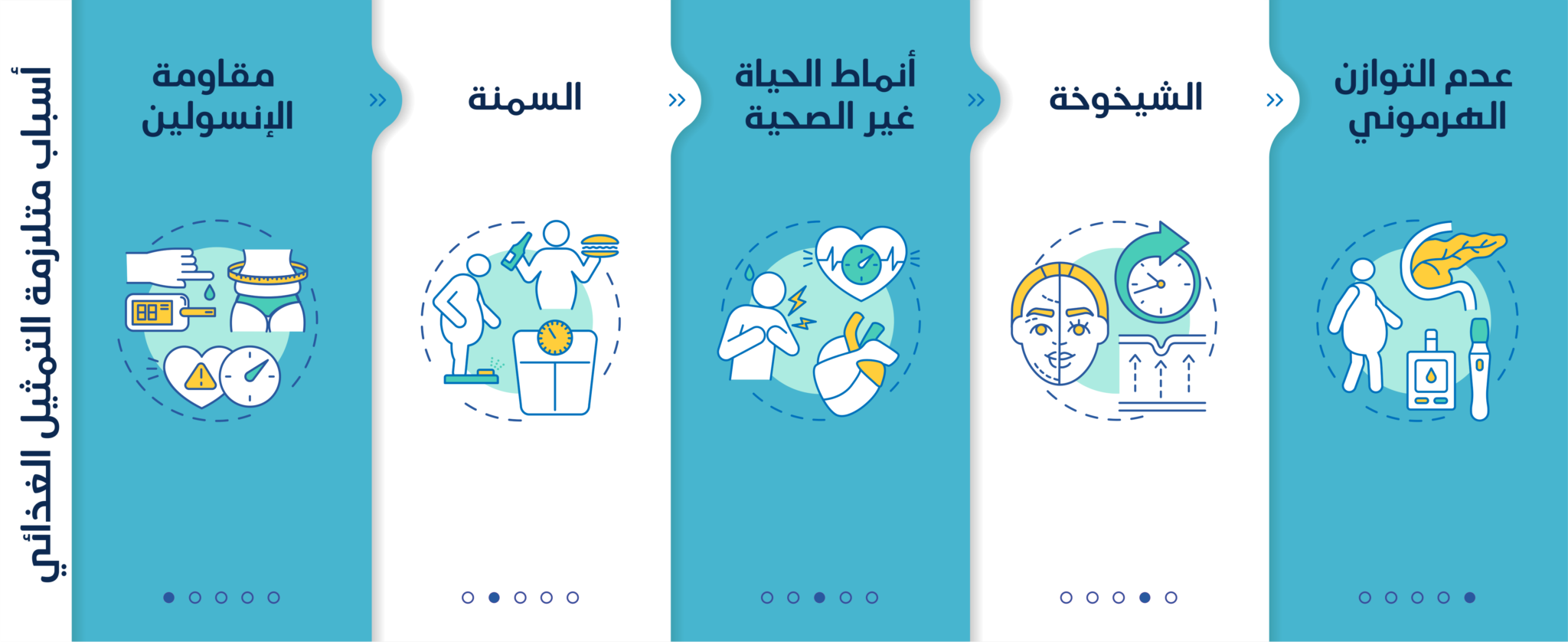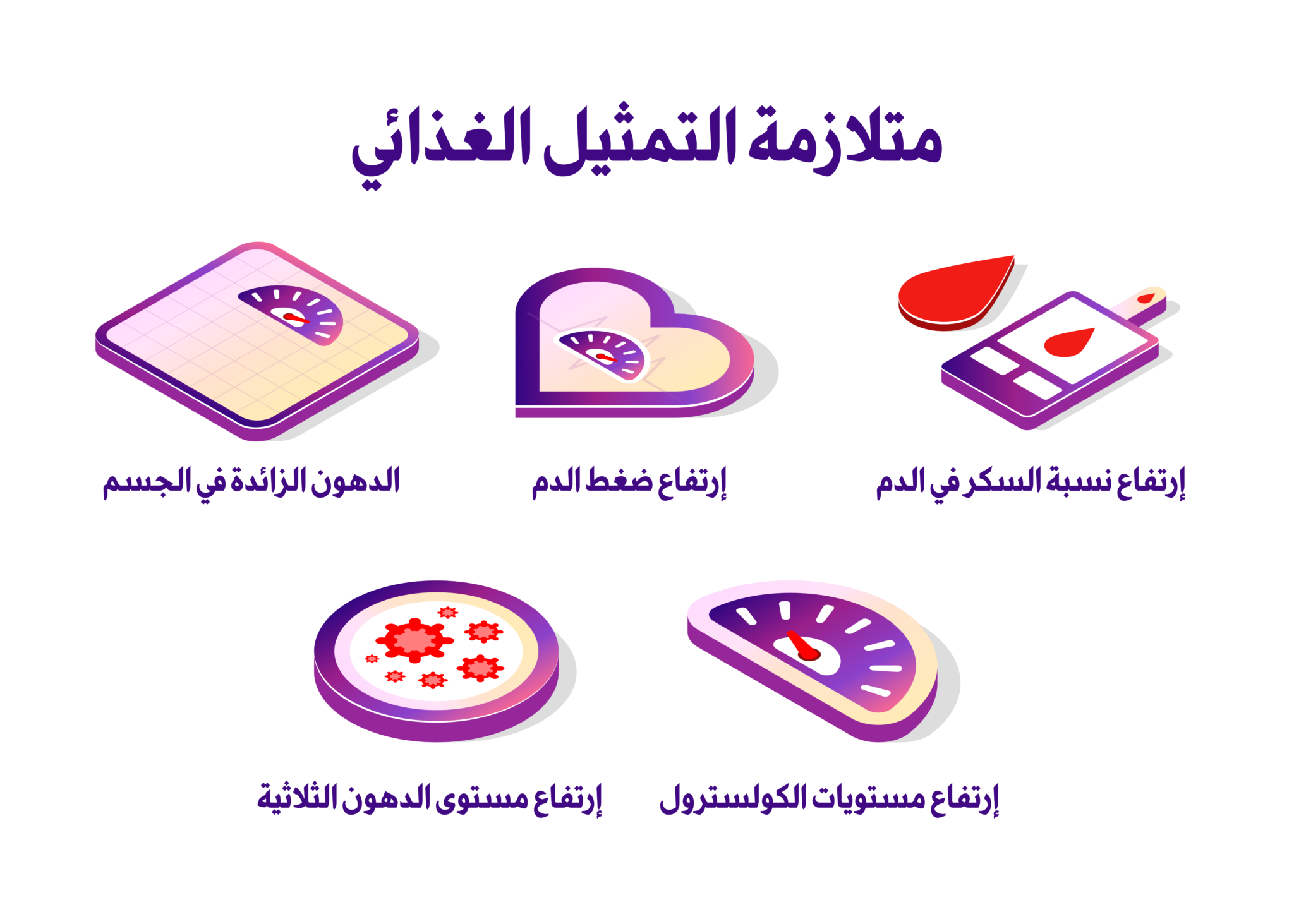 متلازمة التمثيل الغذائي “الأيض” هي مسمى لمجموعة من عوامل الخطر التي تحدث سويا، وتزيد من مخاطر مرض الشريان التاجي والسكتة الدماغية، ومرض السكري من النوع الثاني. وهي تشمل: